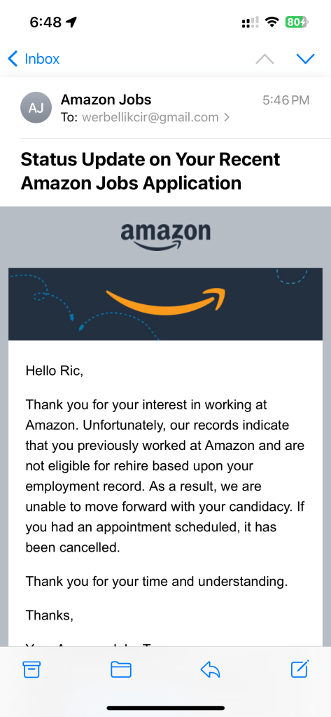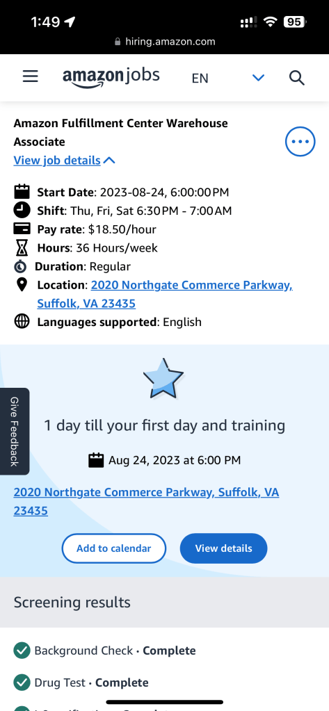 Well I had tried unsuccessfully to get back into Amazon. Tomorrow would have been my Day 1, but I got an email 3 hours ago stating this…